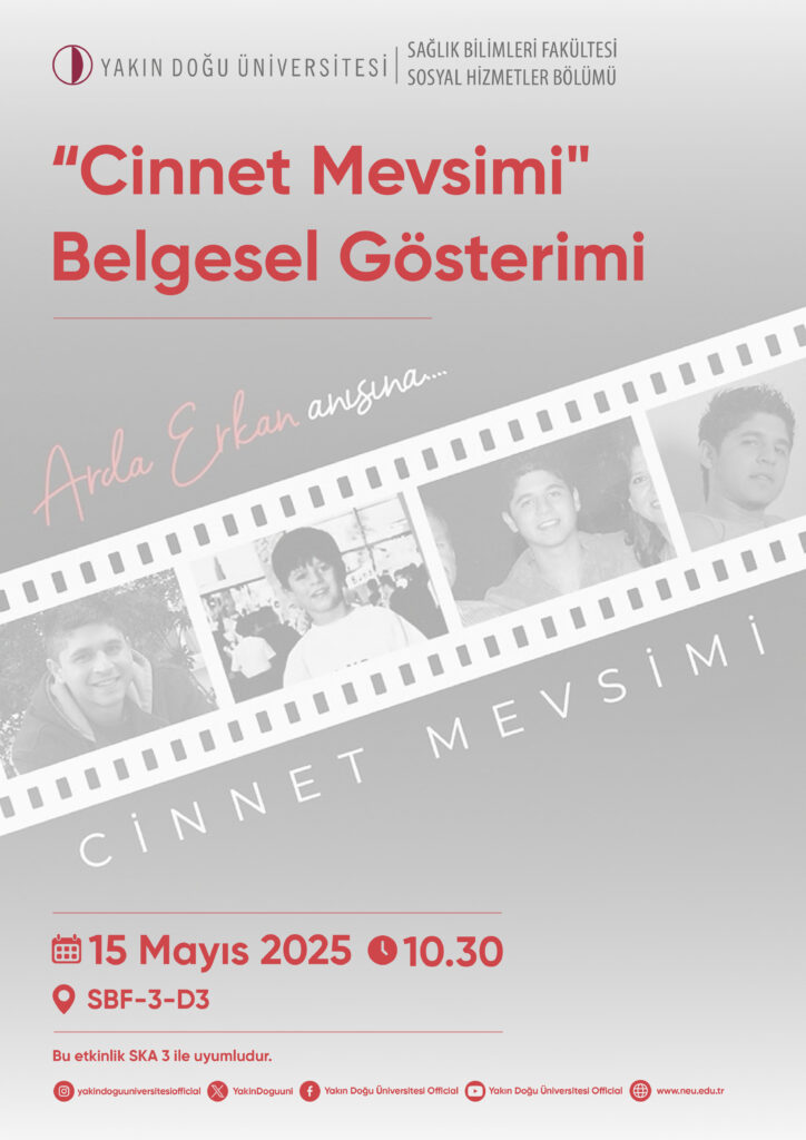Yakın Doğu Üniversitesi Sağlık Bilimleri Fakültesi, Sosyal Hizmet Bölümü Arda Erkan anısına “Cinnet Mevsimi” belgesel gösterimi gerçekleştirdi. 15 Mayıs 2025 tarihinde gerçekleşen etkinliğe Arda Erkan’ın aileside katılım göstermiş ve öğrencilerle paylaşımda bulunmuşlardır.